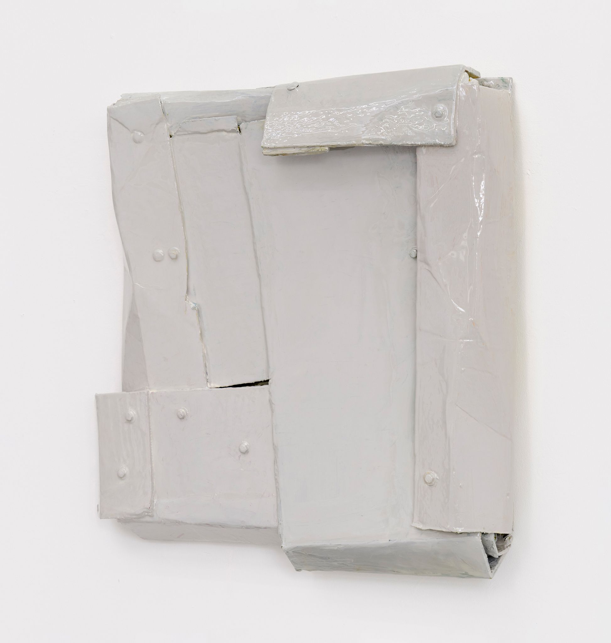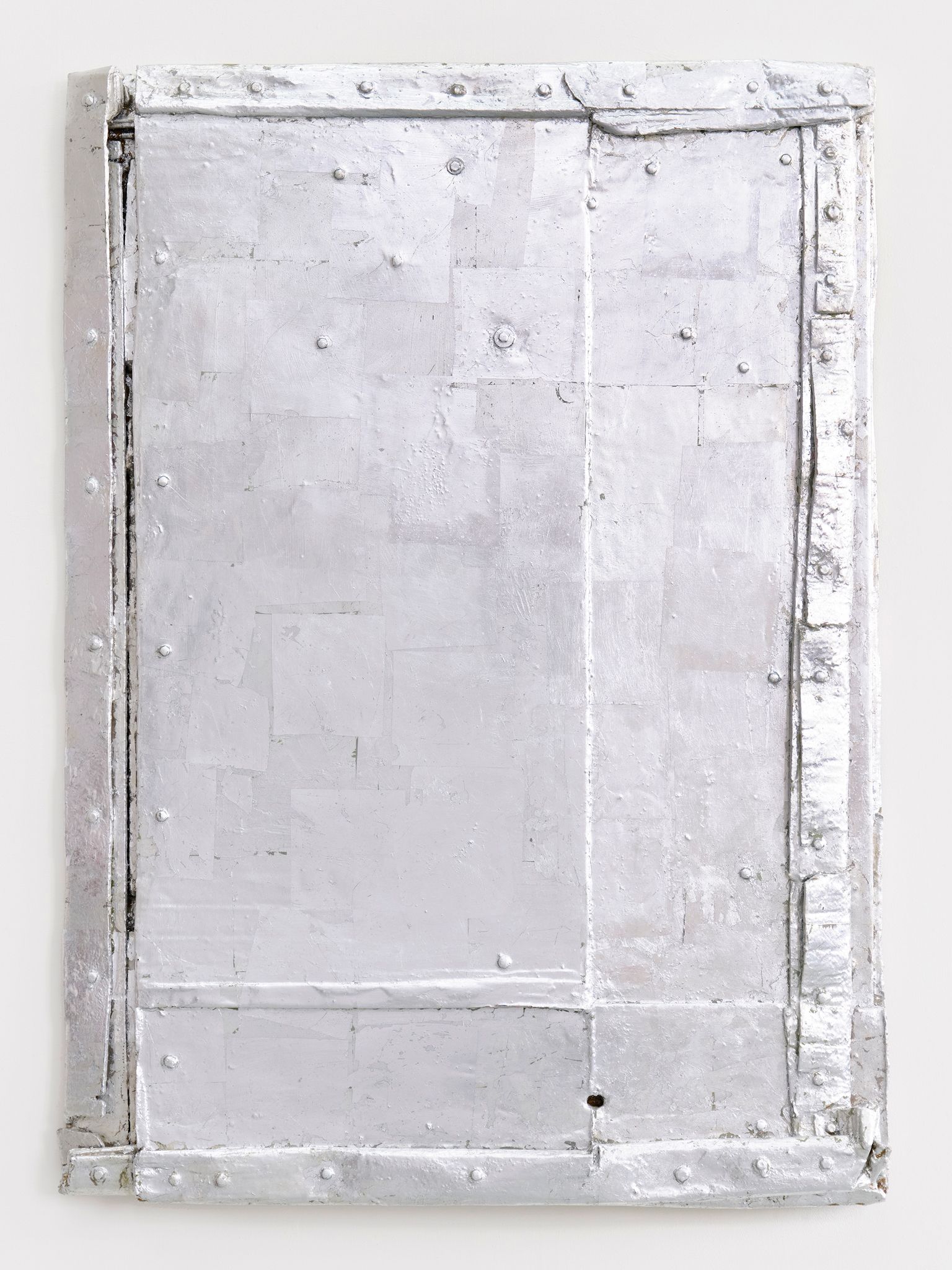Machteld Rullens, Silver Platter (Crushed Corners), 2024, Oil, acrylic, pigment, resin, and bolts on cardboard, 55 x 39.5 x 4 inches