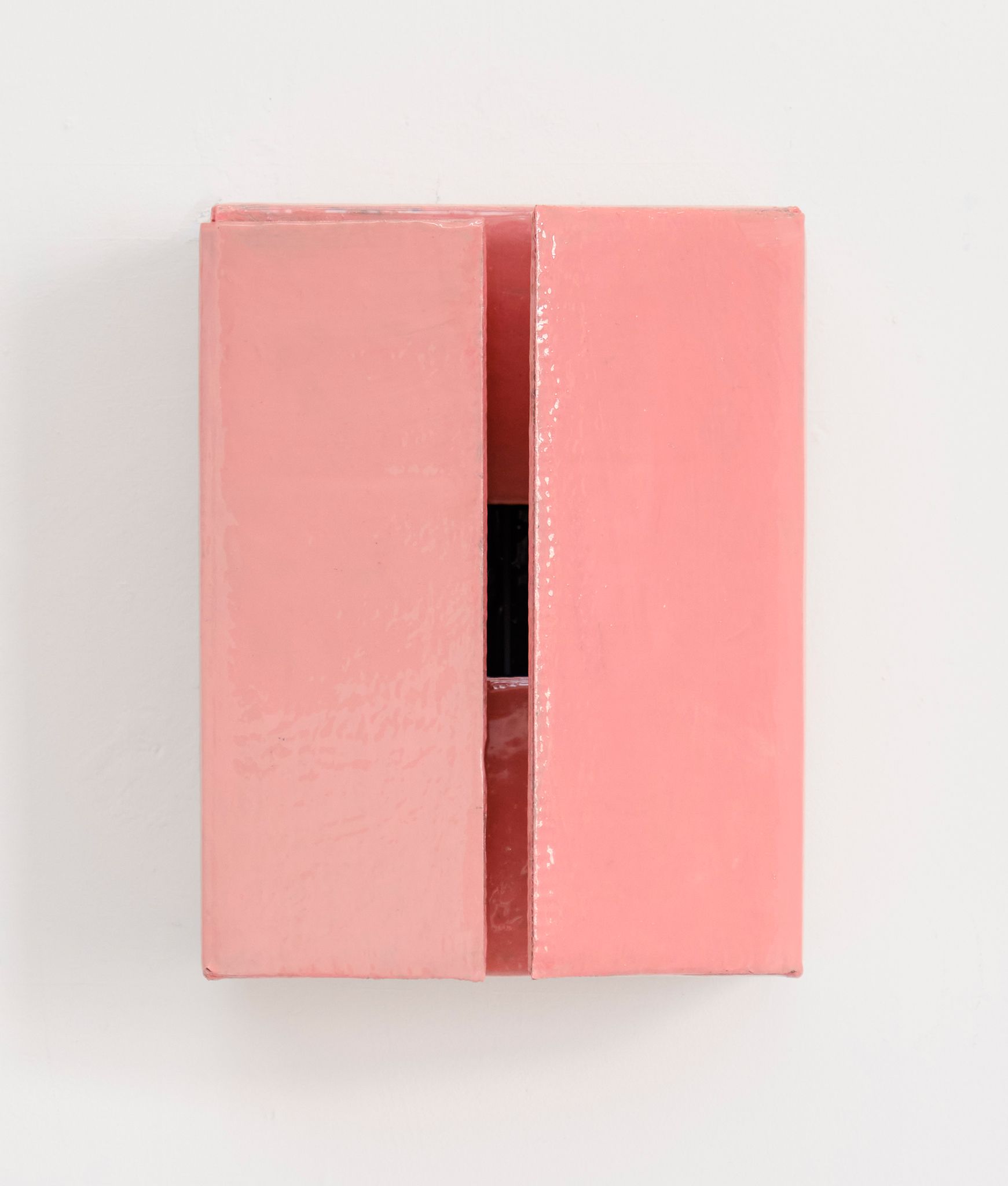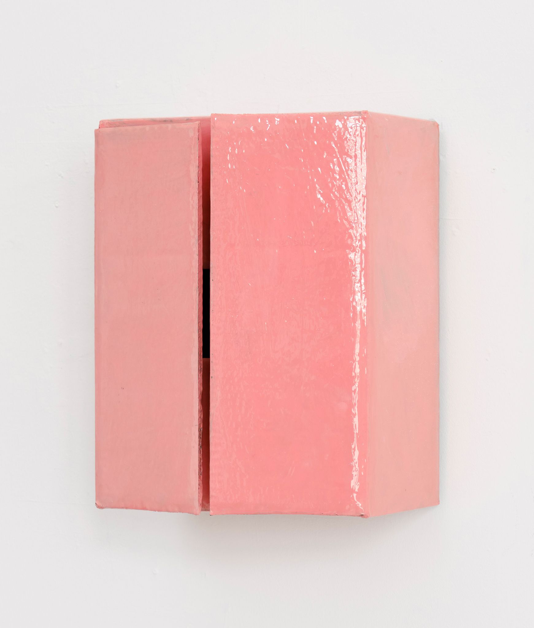 Machteld Rullens, Pink Box, 2024, Oil, acrylic, pigment, and resin on cardboard, 14.5 x 11.5 x 5 inches