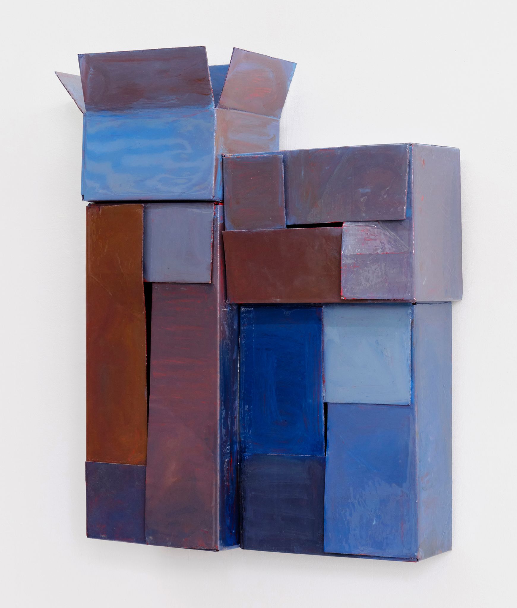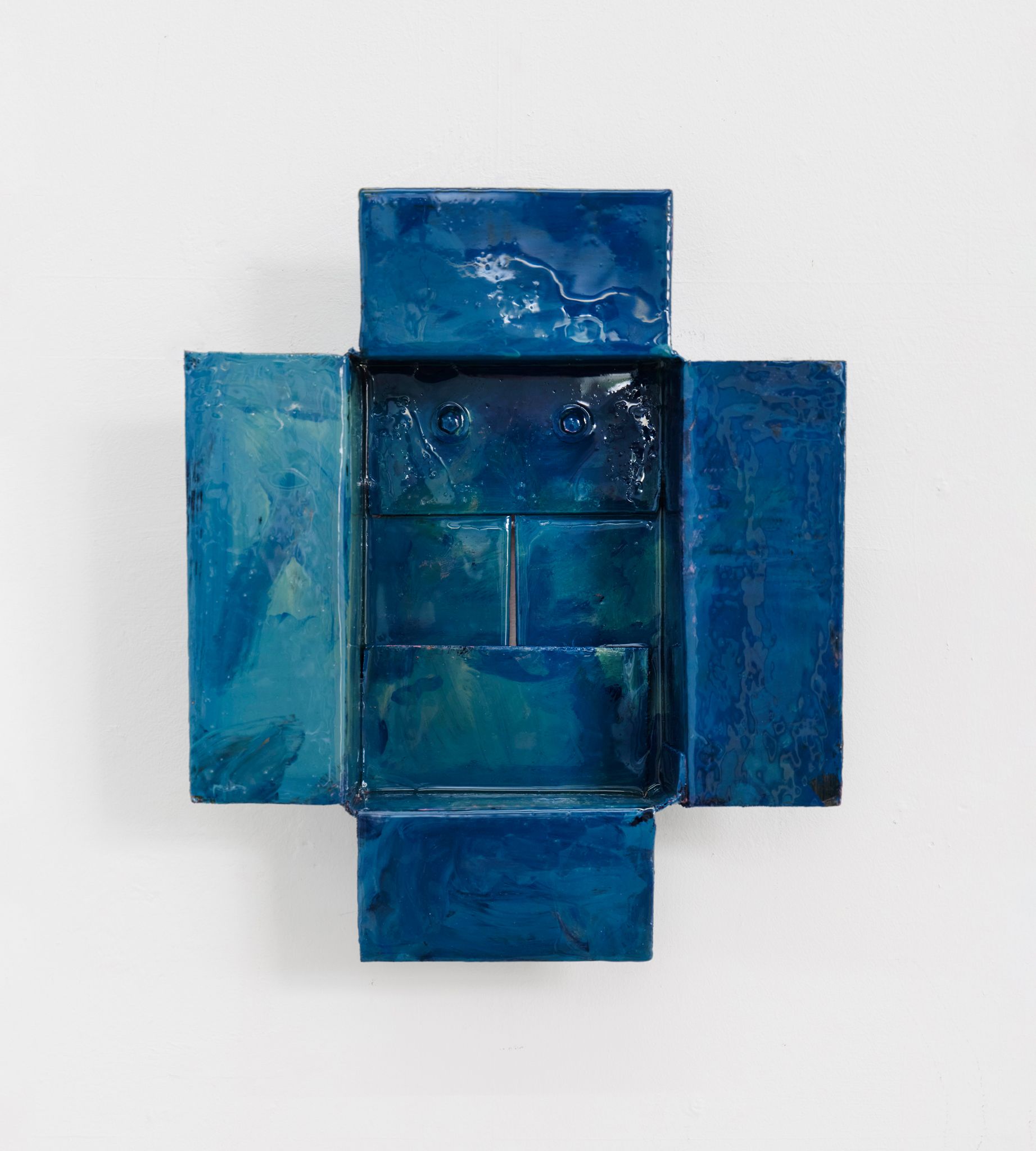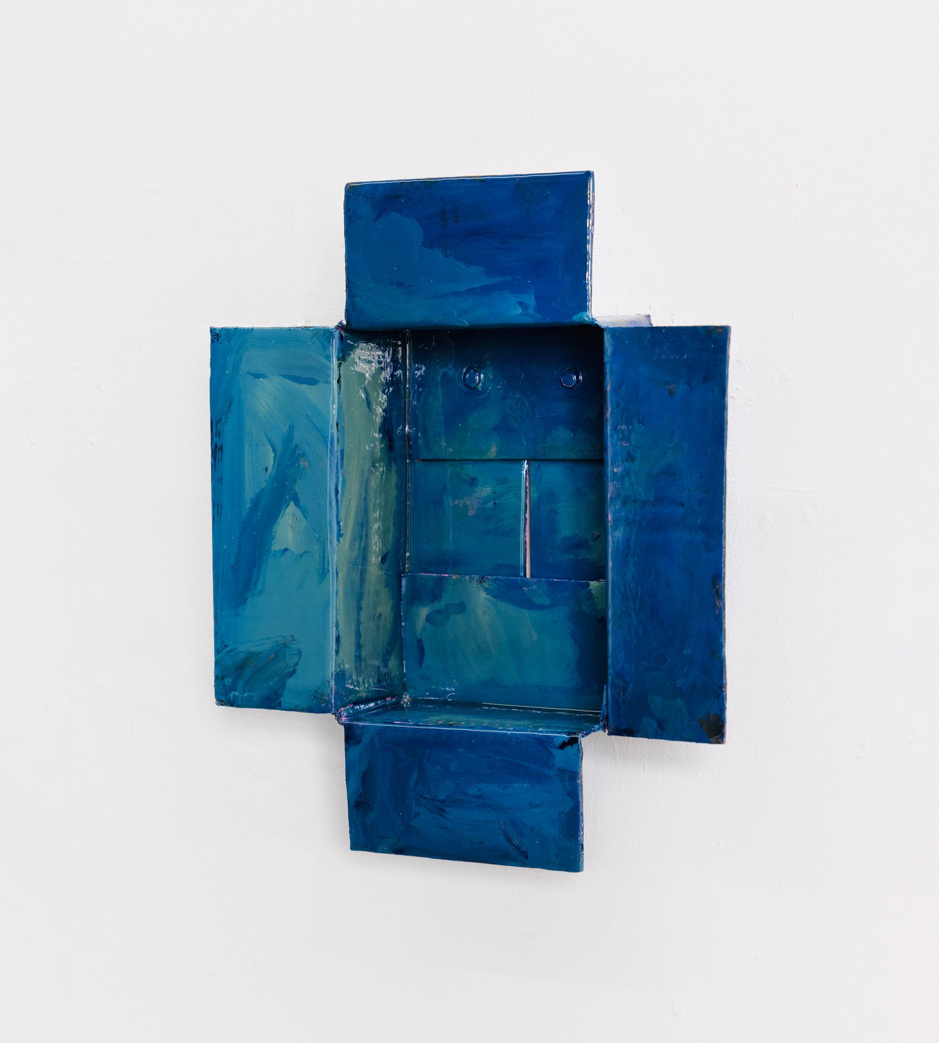 Machteld Rullens, Moving In (Blue Box), 2024, Oil, acrylic, pigment, resin, and bolts on cardboard, 13.75 x 11.75 x 4 inches