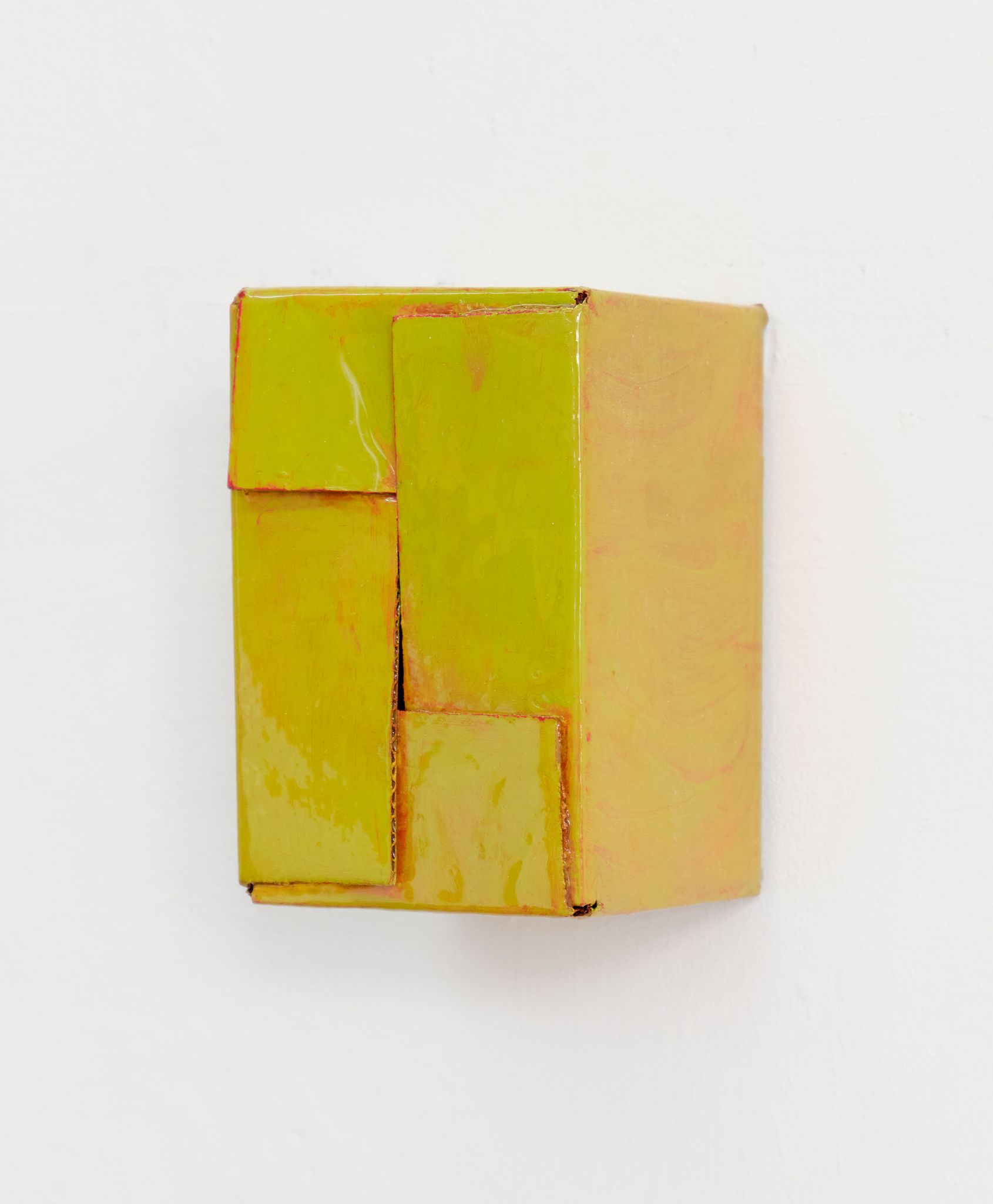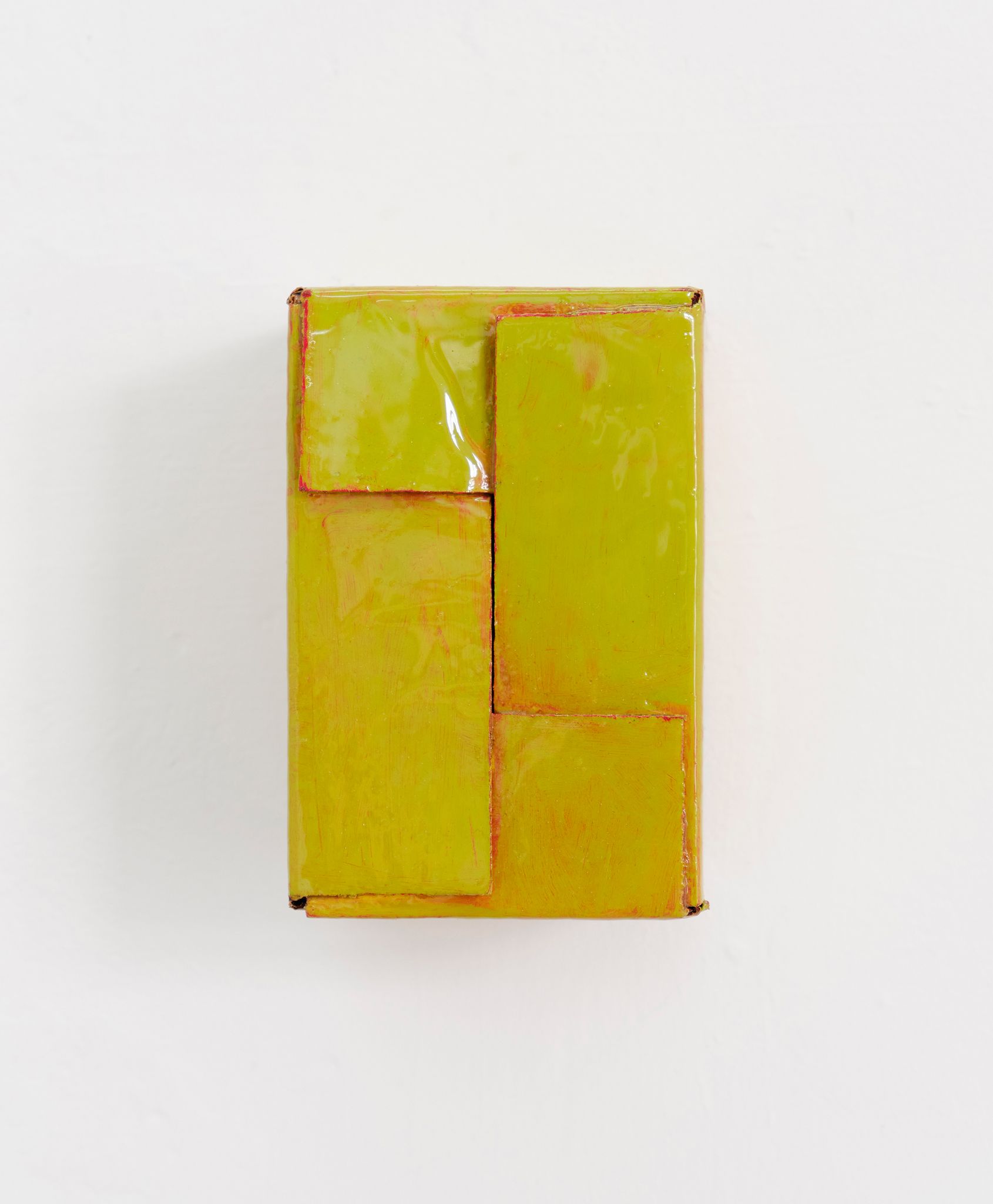 Machteld Rullens, Tiny Bright Green Box, 2024, Oil, acrylic, pigment, and resin on cardboard, 6 x 4 x 4.75 inches