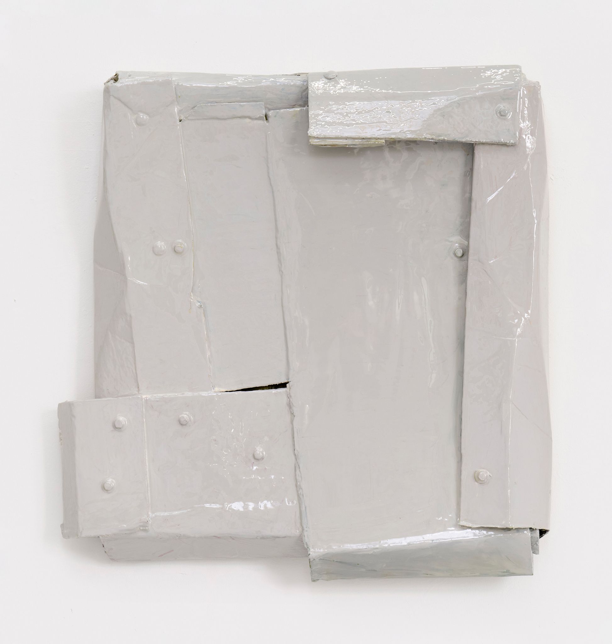 Machteld Rullens, Gravity Grey, 2024, Oil, acrylic, pigment, resin, and bolts on cardboard, 26.5 x 25.5 x 5 inches
