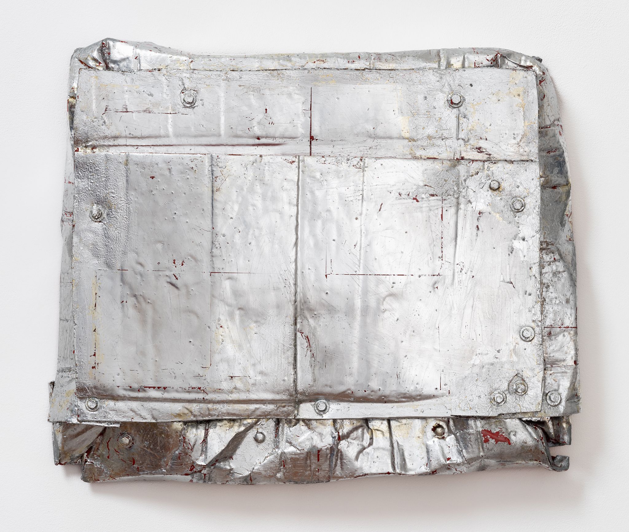 Machteld Rullens, Silver Bullet (Pocket), 2023, Oil, acrylic, pigment, silver leaf, resin, and bolts on cardboard, 21.5 x 26.5 x 3 inches