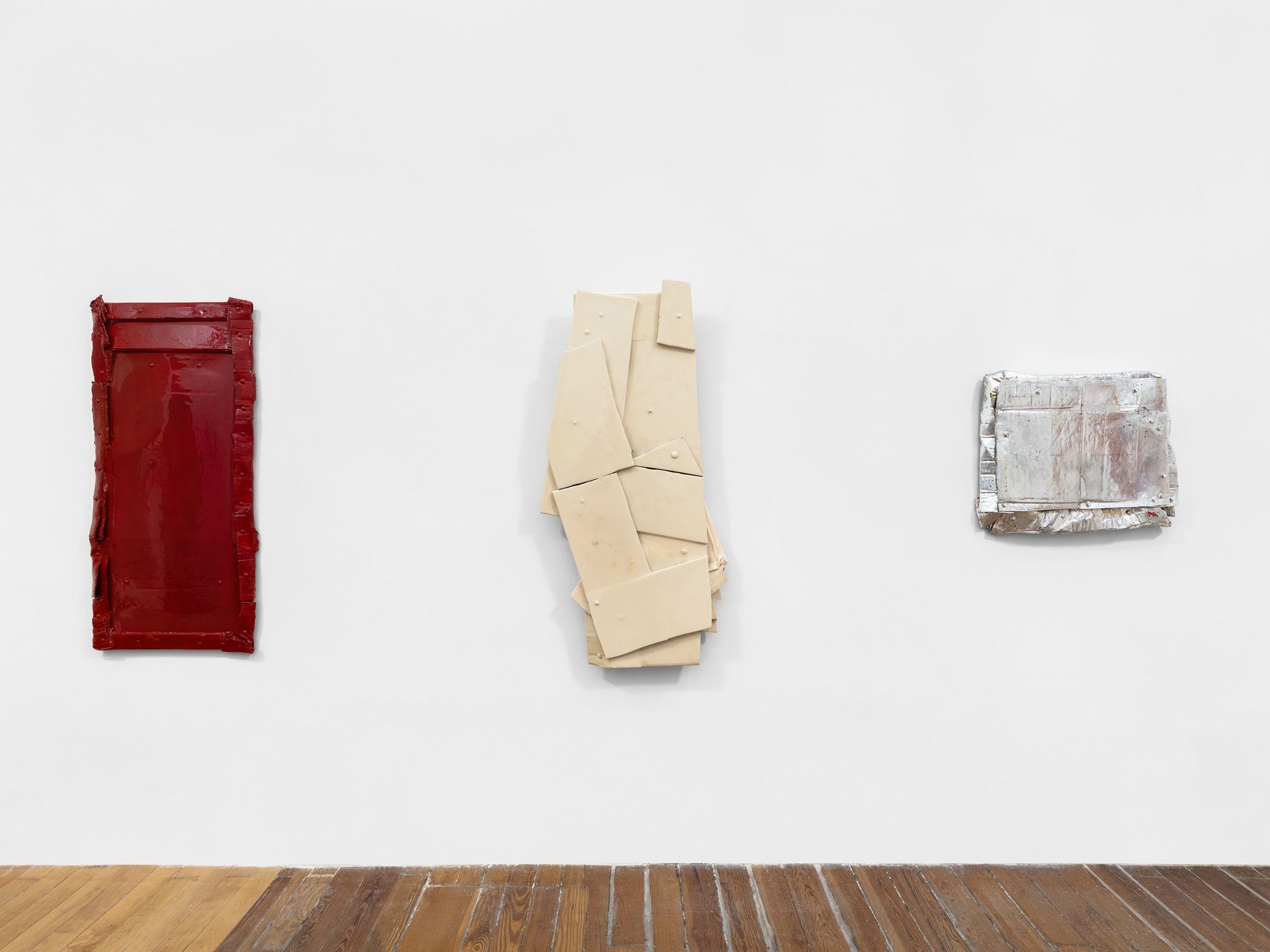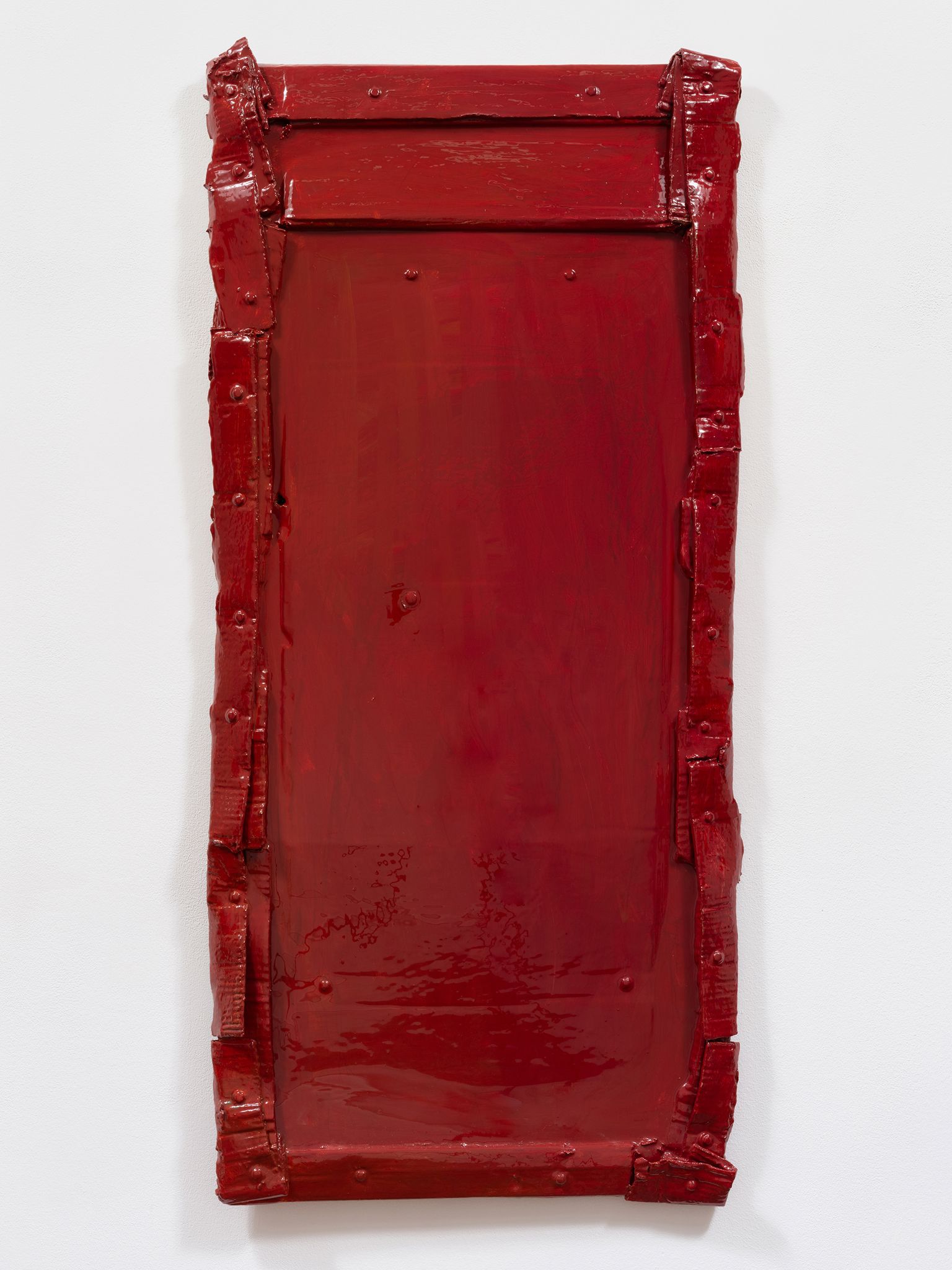 Machteld Rullens, Crushed Bordeaux, 2023, Oil, acrylic, pigment, resin, and bolts on cardboard, 47 x 21.25 x 1.5 inches