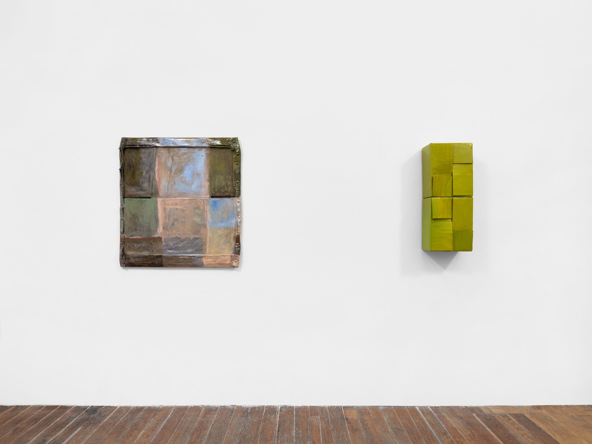 Machteld Rullens, Tender Absorption, 2023, Oil, acrylic, pigment, resin, and bolts on cardboard, 36.25 x 33.5 x 1.5 inches